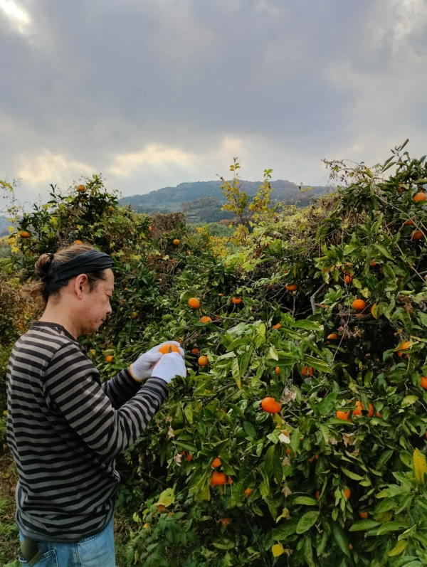 結構しっかり付いててハサミで切らないと取れません。収穫した後、ヘタの部分を2度切りしないと箱の中で他のミカンを傷つけて腐ってしまうんです。青島という古来からある品種で主にジュースになるそうです。昨今の超甘い品種改良されたものとは違います。3人でなんと120KG 収穫!なかなかの出来栄えだったそうです。お土産もらってきたんですが、1ヶ月寝かして糖度を上げたほうがいいのでお家の冷暗所においてあります。