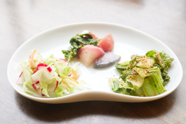 旬の有機野菜を使ったおかずを3種盛り合わせた一皿。おつまみにも、野菜をいろいろ食べたい時にも。おかずもその日によって変わりますが、例えば今なら、ほうれん草&チンゲン菜のゴマ和え、サツマイモ・ゴボウ・ヤーコンの塩麹炒め、赤大根・カブの塩麹漬けと言った感じです。