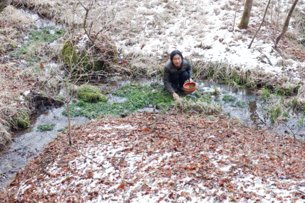 家の前のせせらぎでクレソンを摘むよし子ちゃん